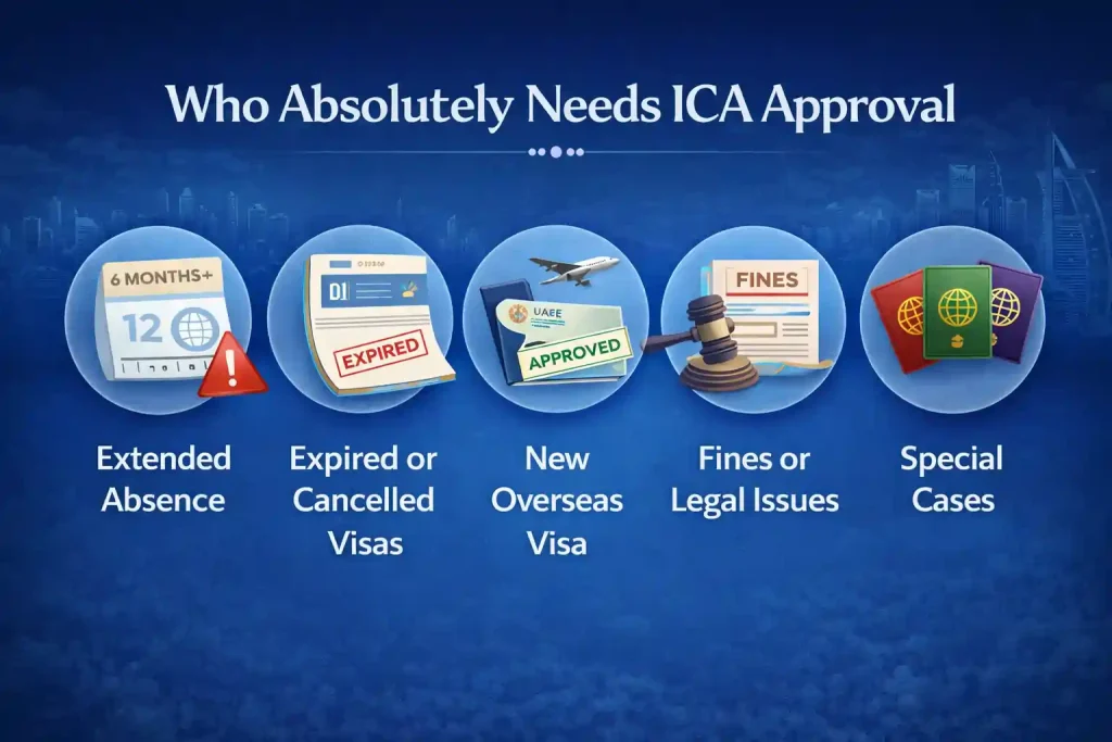 ICA approval is not needed for most UAE residents returning home. That rule ended in late 2022. Travelers with valid residency visas, clean records, and absences under six months can board their flights without any pre-approval.