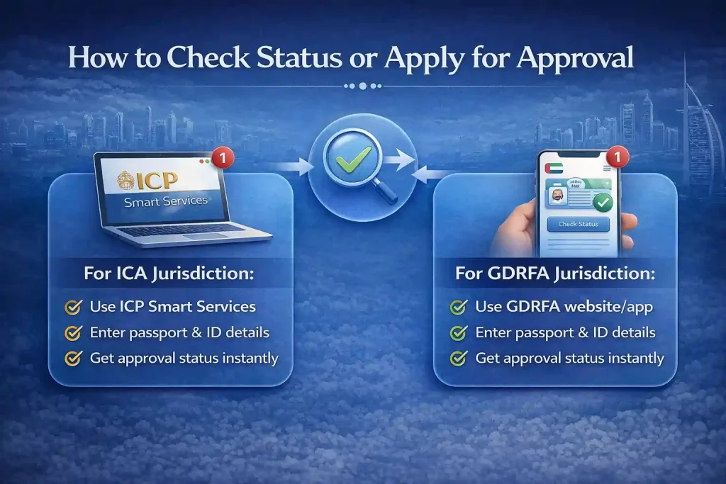 Dubai residents use GDRFA instead of ICA. The entire process, checking status or applying for approval, takes minutes online and costs nothing unless fines need clearing.